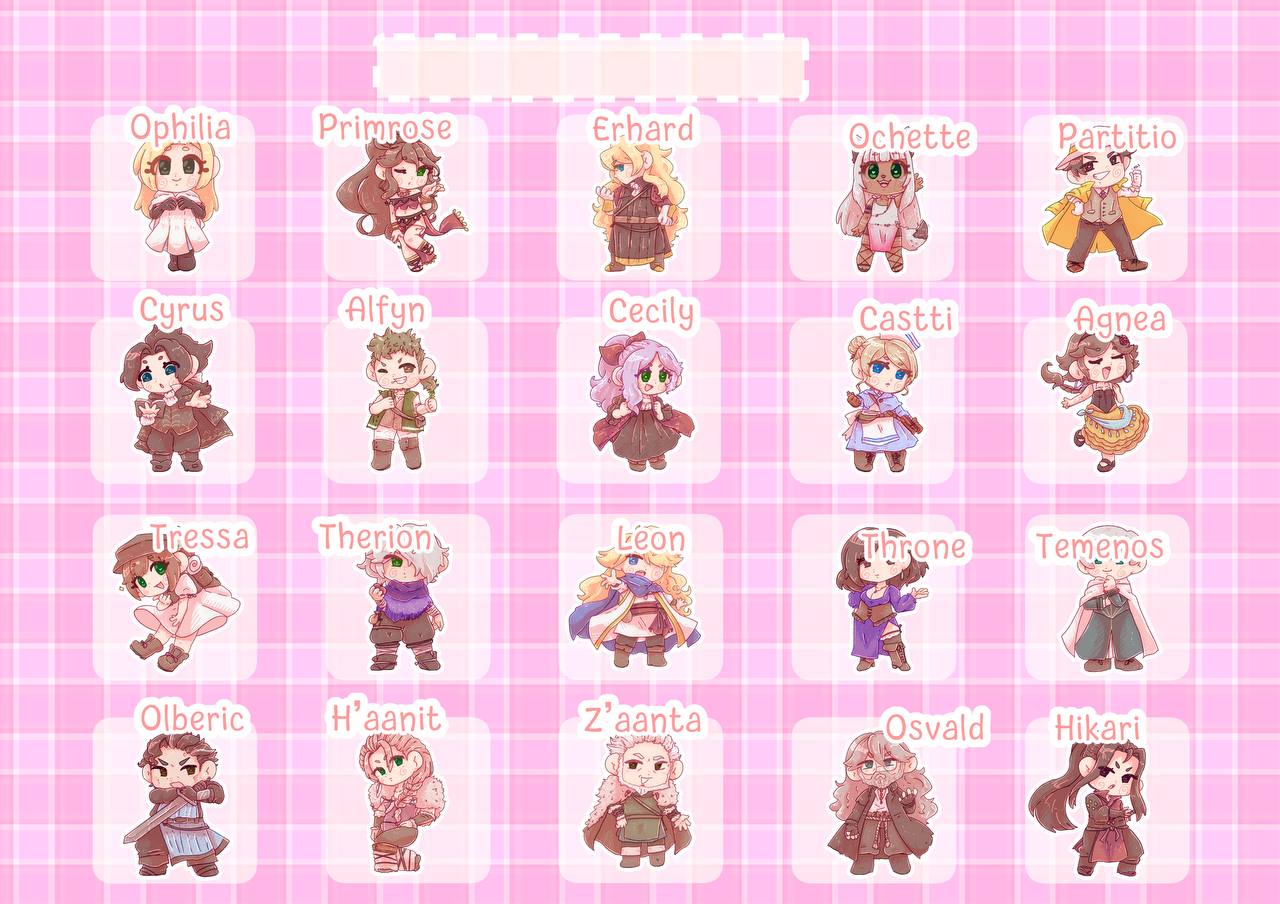 OCTOPATH 1- Ophilia, Cyrus, Tressa, Olberic, Primrose, Alfyn, Therion (set of 8), Leon Bastralle, Z'aanta, Erhardt (Lars/Wrath), Cecily, Odette (also Sacred Blaze), Lianna (also Sacred Blaze)
